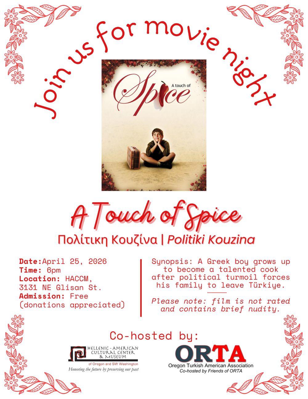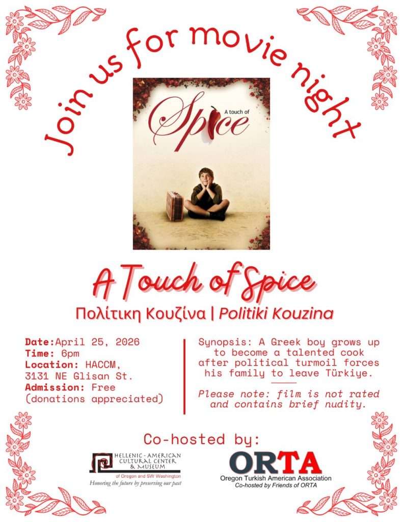 Join HACCM for a special film night, co-hosted by the Oregon Turkish American Association! We will be watching A Touch of Spice, a heartwarming film about Fanis, a young Greek boy whose family must leave Turkey due to political turmoil. Following Fanis’ story from Türkiye to Greece and back to Türkiye, this film is about adding a touch of spice to life.