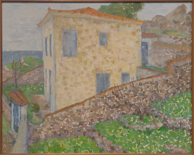 On the coast of Lesbos, Greece, painter Marguerite “Peggy” Frances Sylvia found beauty in the landscape of the coastal city Molivos. The final eleven years of her life were spent on the island of Lesbos, where she learned to paint. Over the decade Peggy lived on Lesbos, her style evolved, first in the style she called “birdnest”, or abstractions of bold color, and ultimately into what she described as “New Humanism.”