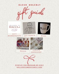 Looking for something special for the arts and culture lover or philhellene in your life? Check out the HACCM gift shop (plus some creative ideas below): your gift to a friend or loved one will also support the museum and cultural center! Call or visit HACCM for more details or to make a purchase.